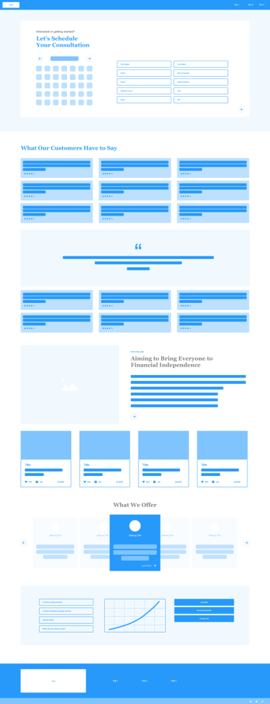 An important step in this project was completing competitive research. I researched three competitors to the company FutureFunds which included Vanguard, Facet, and Wealthramp. I looked at how these companies offered, or did not offer, aspects such as a financial calculator, appointment schedulers, recent blog posts, testimonials, and service offerings. This allowed me to see how other companies are formatting their websites to gather insight into their functionality, flows, potential flaws and features. Understanding these insights helped me to develop strategies to improve FutureFunds wireframes.