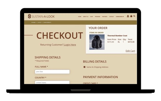 Pictured here is the original prototype for Sustain-A-Look’s website, specifically the product selection and check out pages.