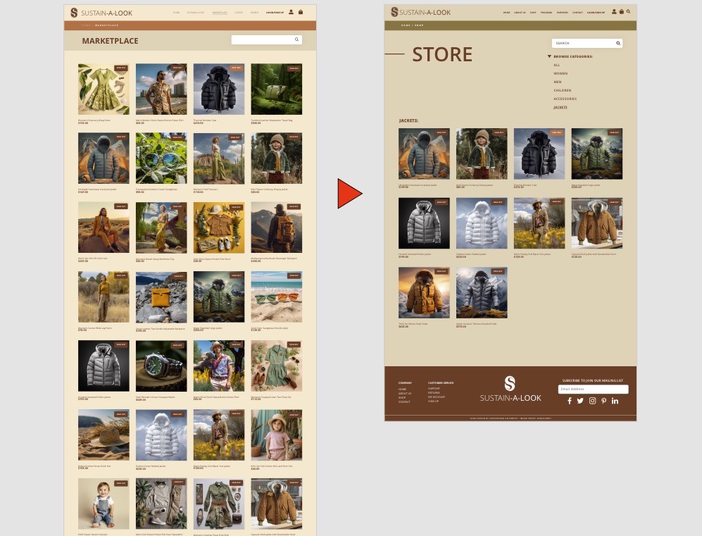 After reviewing the user feedback, I redesigned Sustain-A-Look’s product selection and checkout pages to address the errors and issues found. I included navigation from the Checkout back to the Marketplace page, provided the ability for users to review their orders before completing the checkout process, and included brand consistency across all pages.