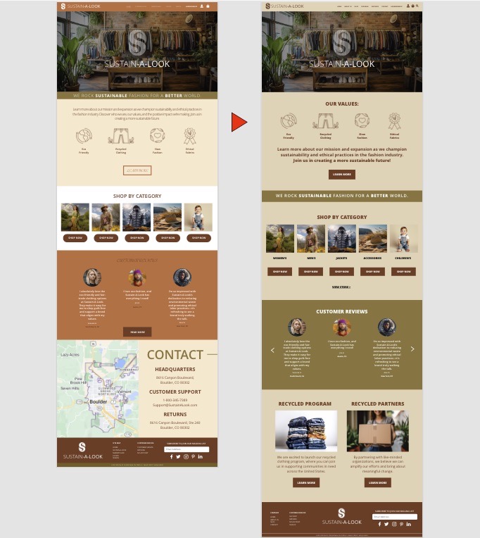 Pictured is the before (left) and after (right) of the Home page after making updates in Adobe XD. The colors were changed to provide brand consistency amongst all pages including the navigation, as well as confirmed through contrast checkers such as webaim.org to ensure readability for body copy, headers, footers and CTA buttons. The informational hierarchy amongst the page was organized and simplified to help the users find what they are looking for quicker and easier without cognitive overload, as well as highlight the two new pages that were added to the website: Recycled Program and Recycled Partners.